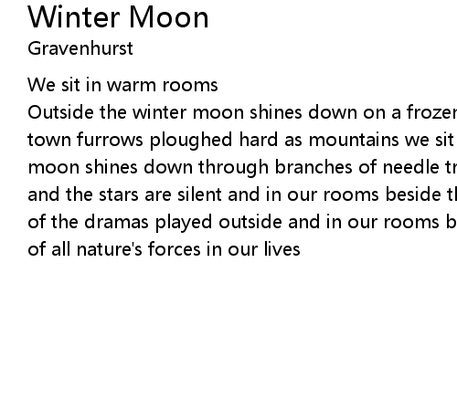 | Outside the winter moon shines down on a frozen field far beyond the edge of town furrows ploughed hard as mountains we sit in warm rooms outside the winter moon shines down through branches of needle trees rake the black sky like leaves and the stars are silent and in our rooms beside the fire we talk ignoring all of the dramas played outside and in our rooms beside the fire we drink unaware of all nature's forces in our lives |