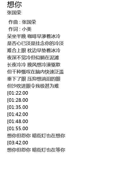 | [02:02.00] | 想你但怨你 暗街灯也在想你 |