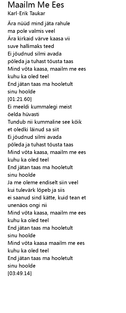 | [03:16.49] | Mind võta kaasa maailm me ees |