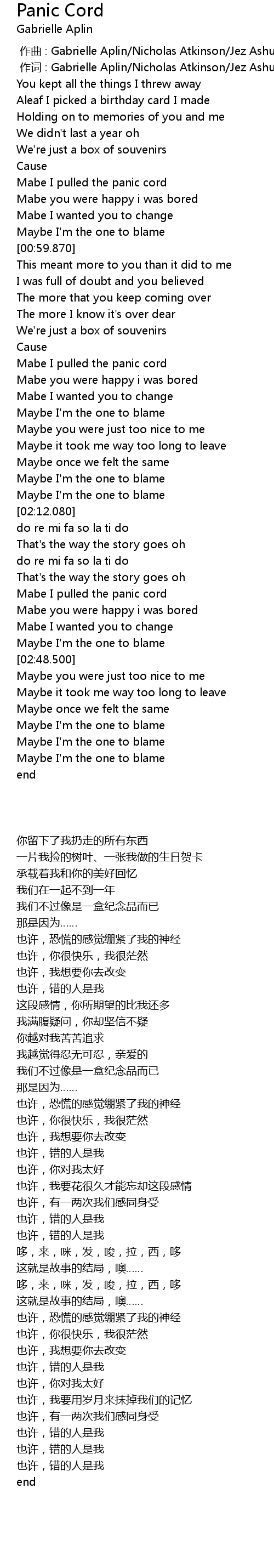| [00:00.00] | zuo qu : Gabrielle Aplin Nicholas Atkinson Jez Ashurst |