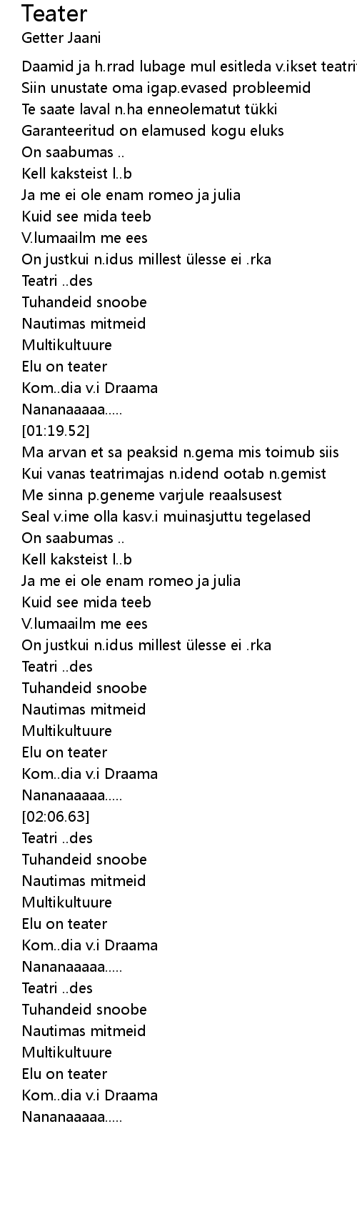 | [01:26.52] | Kui vanas teatrimajas n.idend ootab n.gemist |