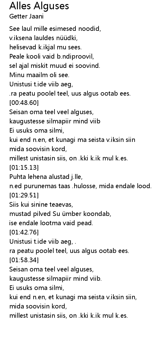| [01:00.17] | kui end n. en, et kunagi ma seista v. iksin siin |