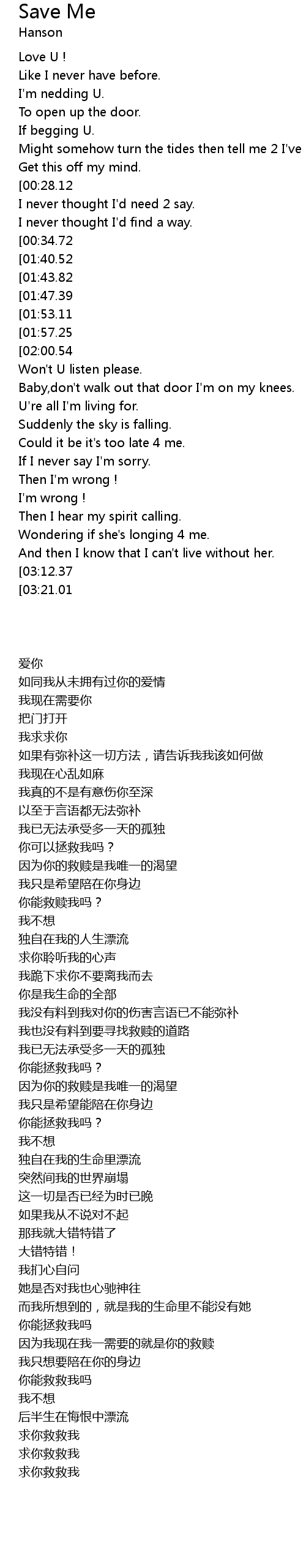 | [02:54.04][01:53.11][00:53.76] | Won' t U save me ? |