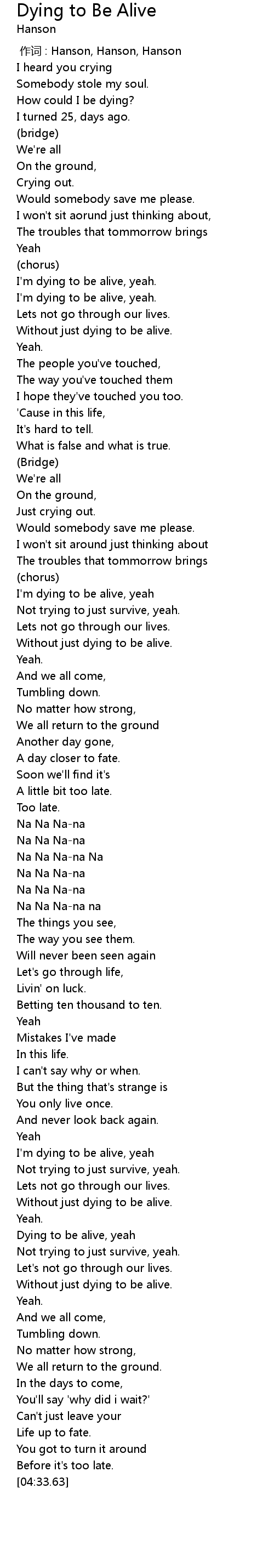 | [03:33.04] | Dying to be alive, yeah |