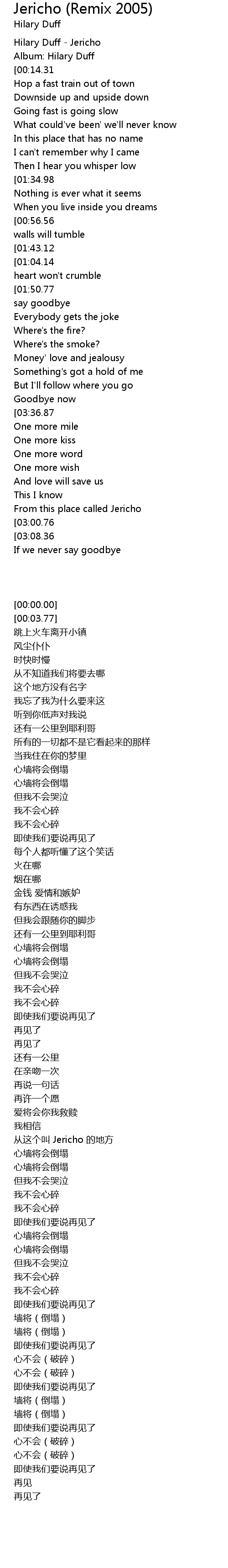| [00:43.86][01:34.98] | One more mile to Jericho |