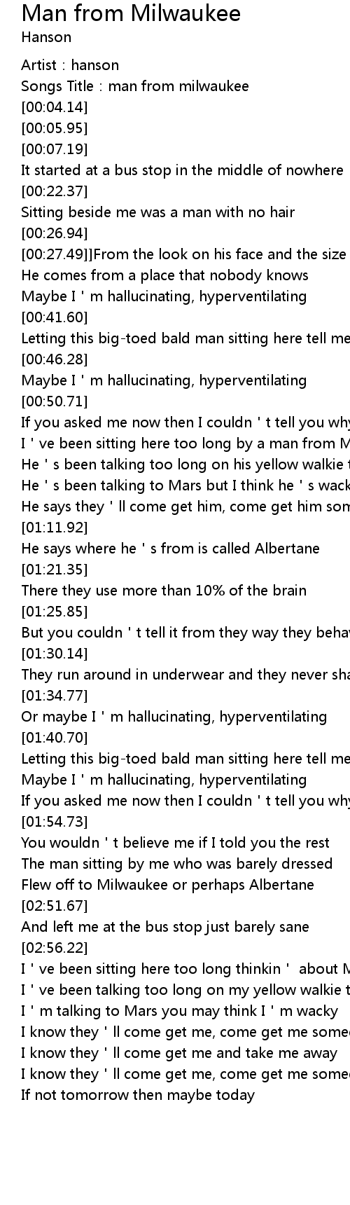 | [00:01.82] | Songs Title: man from milwaukee |