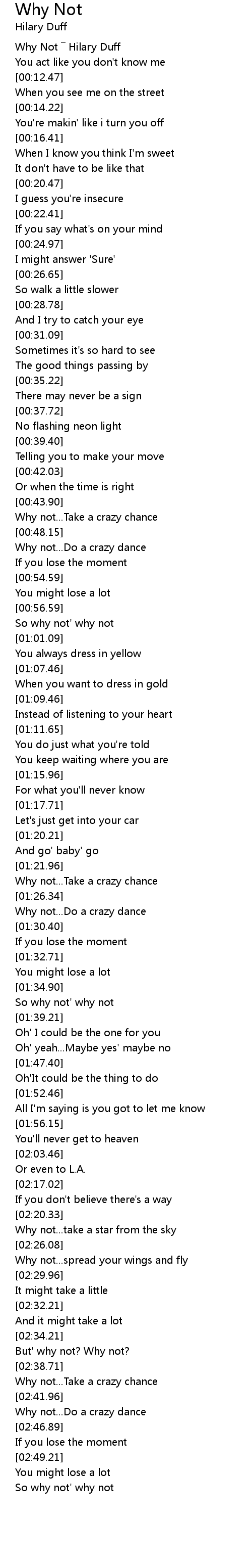 | [00:01.47] | Why Not ― Hilary Duff |