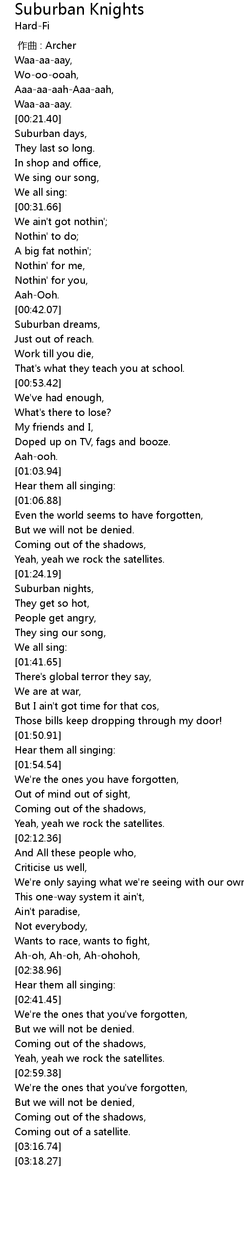 | [01:33.22] | Suburban nights, |
