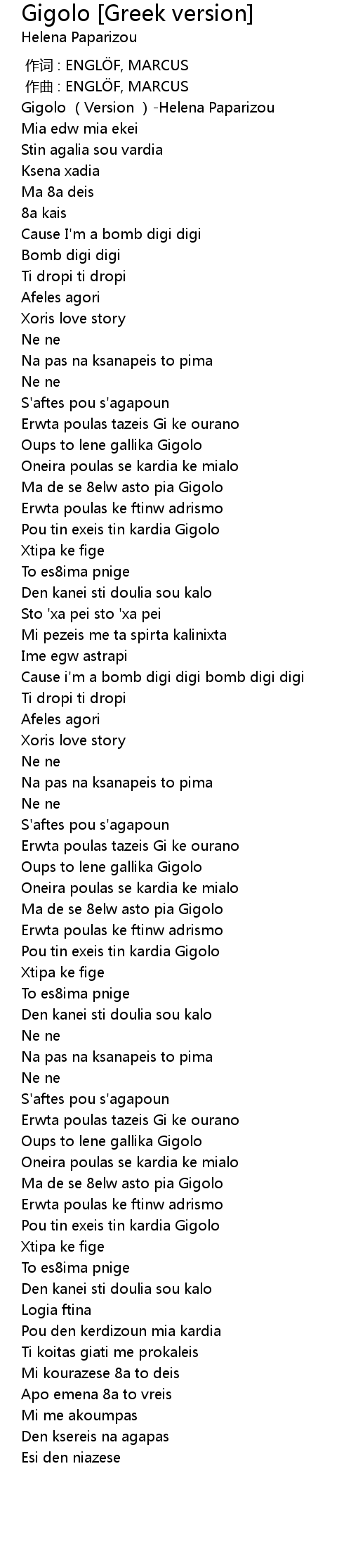 | [00:00.00] | Gigolo Version Helena Paparizou |