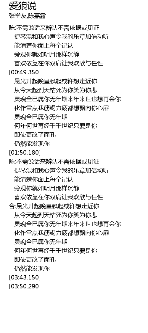 | [02:57.500] | 灵魂全已属你无年期来年来世也想再会你 |