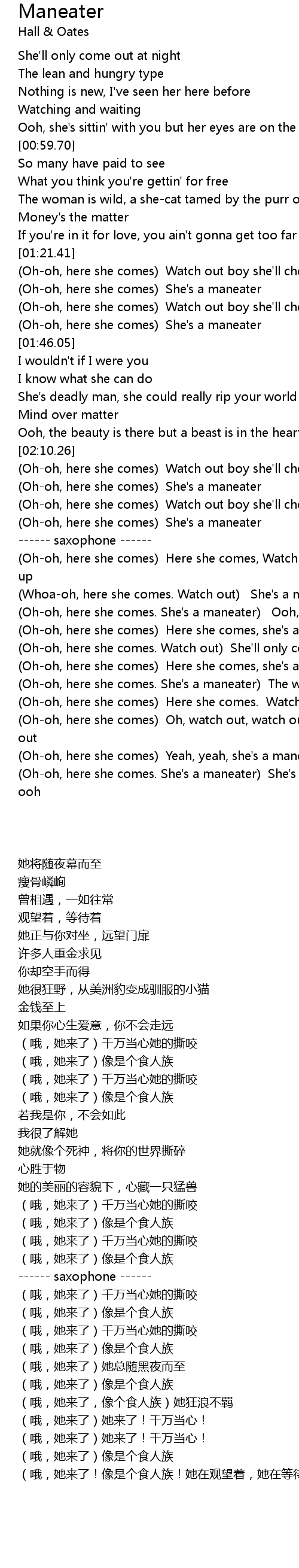 (Whoa-oh, here she comes. Watch out) She's a maneater |