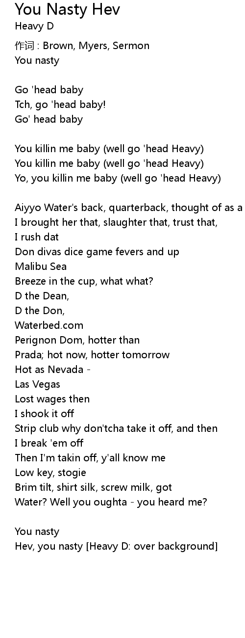 | So yo you killin me baby well go ' head Heavy Heavy D | |