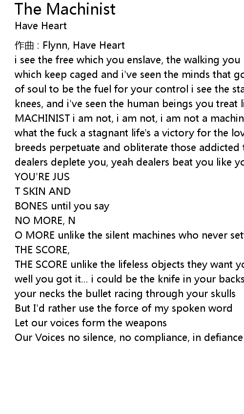 | MACHINIST i am not, i am not, i am not a machine i am, i am, i am a human being what the fuck a stagnant life' s a victory for the lover of life that never breeds perpetuate and obliterate those addicted to living on their knees the dealers deplete you, yeah dealers beat you like you' re drum without a tone | |