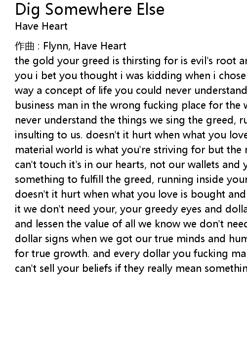 | the gold your greed is thirsting for is evil' s root and the pride of fools, and you i bet you thought i was kidding when i chose to be broke in the most humble way a concept of life you could never understand an ideal too right for a business man in the wrong fucking place for the wrong fucking things you could never understand the things we sing the greed, running inside your head is so insulting to us. doesn' t it hurt when what you love is bought and sold? a material world is what you' re striving for but the real gold is something you can' t touch it' s in our hearts, not our wallets and you' re turning into something to fulfill the greed, running inside your head is so insulting to us. doesn' t it hurt when what you love is bought and sold? and when it comes down to it we don' t need your, your greedy eyes and dollar signs to cheapen the worth and lessen the value of all we know we don' t need your, your greedy eyes and dollar signs when we got our true minds and humble hearts the only tools we need for true growth. and every dollar you fucking make is more spit in my face you can' t sell your beliefs if they really mean something to you. |