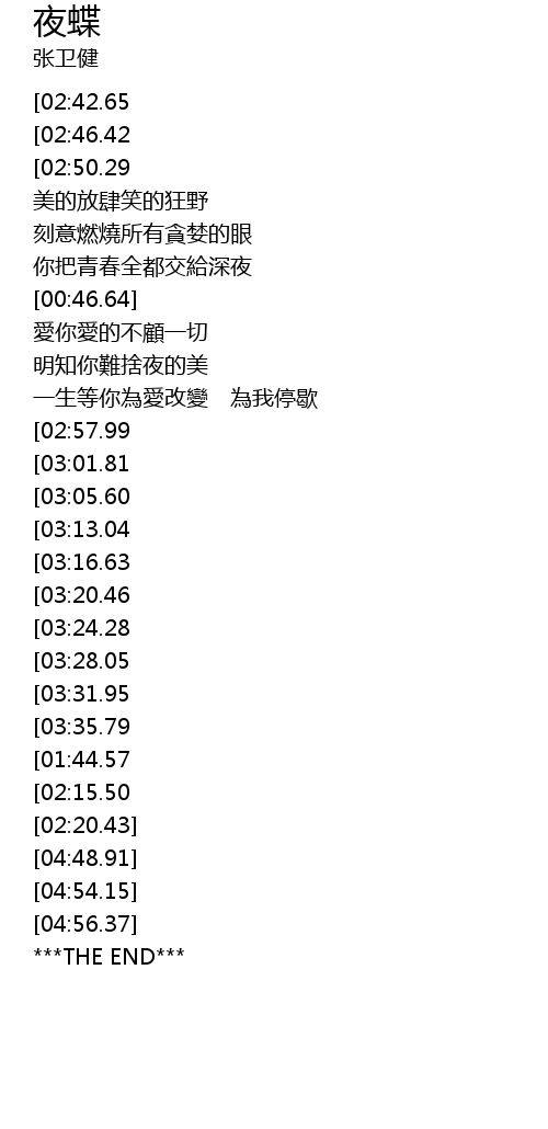 | [04:22.16][02:50.29][00:24.80] | 你像穿梭在霓虹之間 不倦的蝶 |