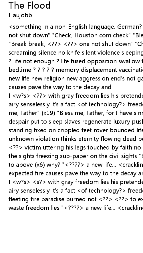 <something in a non-English language. German?>" (x2) "Break break, <??> <??> one not shut down" "Check, Houston com check" "Bless me Father, for I have sinned" "Break break, <??> <??> one not shut down" "Check, Houston com check" a life screaming silence no knife silent violence sleeping beast green eyes not enough ? life not enough ? life fused opposition swallow faith under m?d?n ?r?ys grace bedtime ? ? ? ? ? memory displacement vaccination wins/whims new start new area new life new religion new aggression end's not gained never bomb expected fire causes pave the way to the decay and |