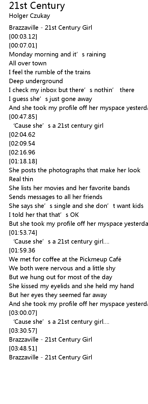 | [00:00.00] | Brazzaville - 21st Century Girl |