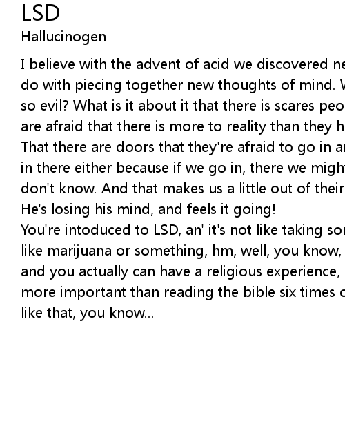 | You're intoduced to LSD, an' it's not like taking some other drug for instance like marijuana or something, hm, well, you know, it's altogether a new thing, and you actually can have a religious experience, and, hm, and it can be even more important than reading the bible six times or becoming a pope or something like that, you know... |