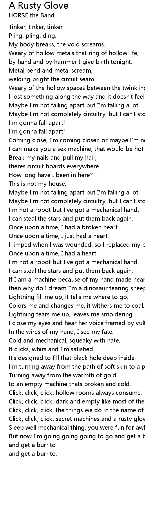 Click, click, click, secret machines and a rusty glove. |