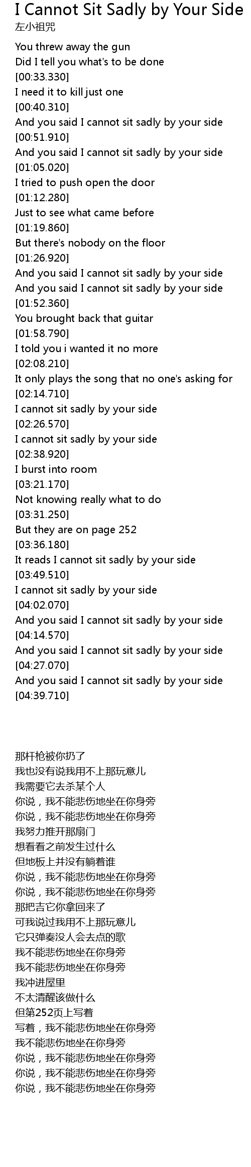 | [03:38.440] | It reads I cannot sit sadly by your side |