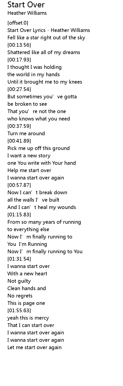 | [00:00.64] | Start Over Lyrics Heather Williams |