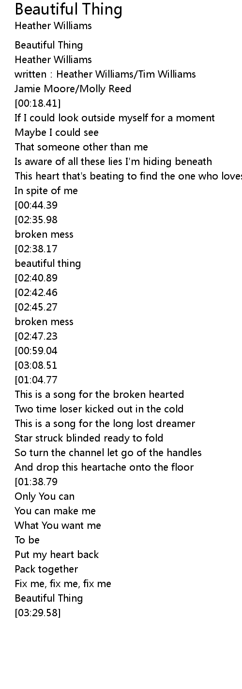 | [00:08.95] | written: Heather Williams Tim Williams |