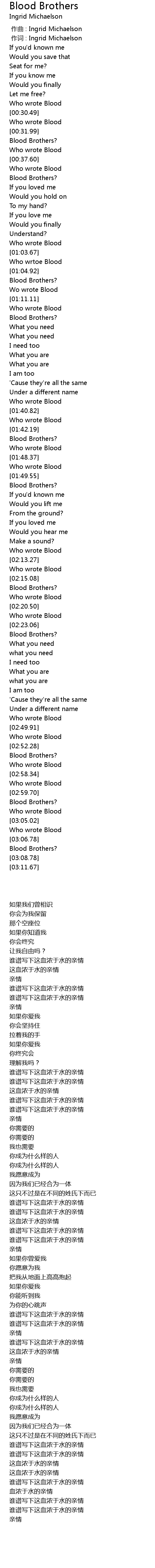 | [02:23.68] | Blood Brothers? |