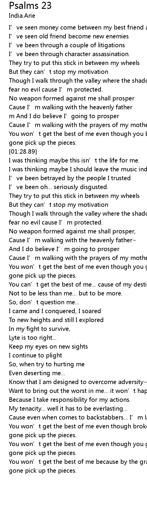 | [00:43.69] | Though I walk through the valley where the shadow of death is... I fear no evil cause I’m protected. |