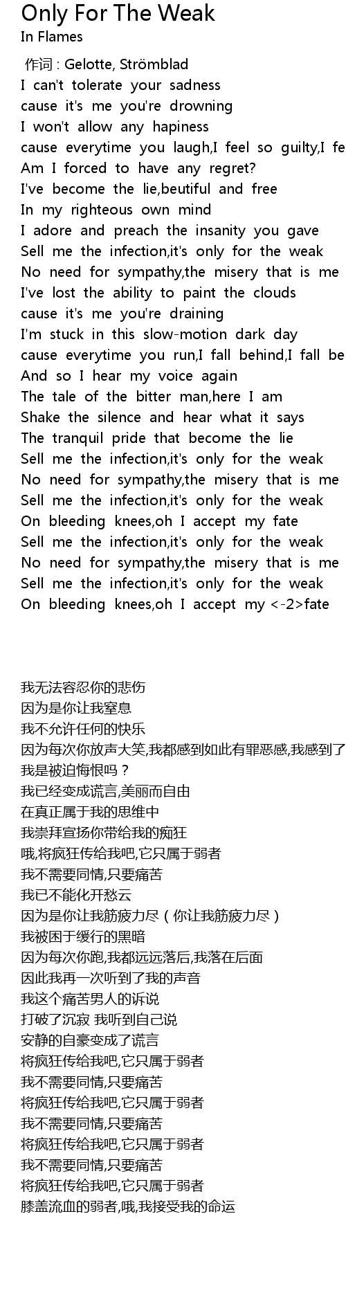 | [02:23.74] | Sell me the infection, it' s only for the weak |