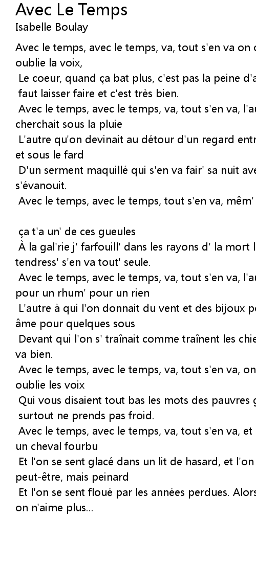 | Avec le temps, avec le temps, va, tout s'en va, on oublie les passions et l'on oublie les voix | |