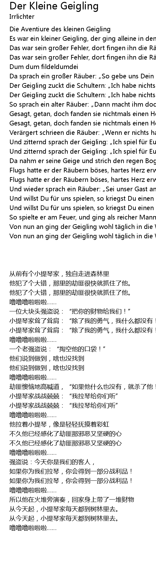 | Es war ein kleiner Geigling, der ging alleine in den Wald | |