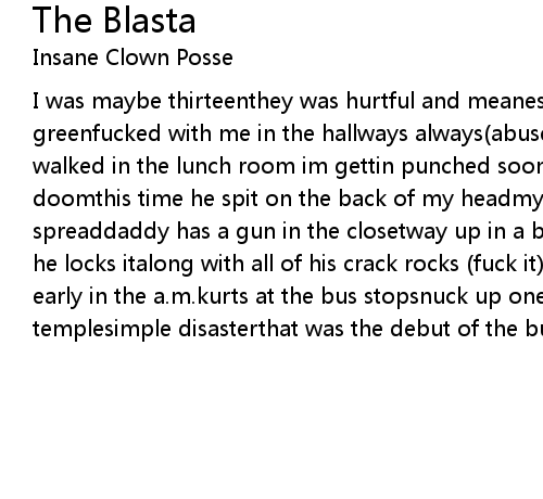 I was maybe thirteenthey was hurtful and meanespecially this one fucker kurt greenfucked with me in the hallways always(abuse the loser) they would all sayi walked in the lunch room im gettin punched soonif kurt green sees me here comes doomthis time he spit on the back of my headmy face turned red as the laughter spreaddaddy has a gun in the closetway up in a black boxits too bad though cause he locks italong with all of his crack rocks (fuck it)icepick in my hand up early in the a.m.kurts at the bus stopsnuck up one plusstuck em in the templesimple disasterthat was the debut of the bully blasta |