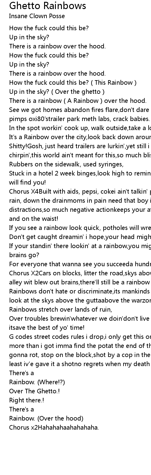 Chorus X2Cars on blocks, litter the road,skys above glitter with gold,body in an alley wit blew out brains,there'll still be a rainbow after it rains! |