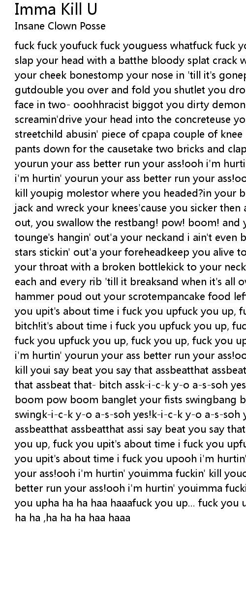 fuck fuck youfuck fuck youguess whatfuck fuck youfuck fuck youguess whatfirst i slap your head with a batthe bloody splat crack wooden batwind it back whack your cheek bonestomp your nose in 'till it's gonepick you back up and puch your gutdouble you over and fold you shutlet you drop and invite the crewto kick you face in two- ooohhracist biggot you dirty demondig your eyes out while your screamin'drive your head into the concreteuse your forehead to paint the streetchild abusin' piece of cpapa couple of knee drops across your backrip your pants down for the causetake two bricks and clap your ballsooh i'm hurtin' yourun your ass better run your ass!ooh i'm hurtin' youimma fuckin' kill youooh i'm hurtin' yourun your ass better run your ass!ooh i'm hurtin' youimma fuckin' kill youpig molestor where you headed?in your back my knife's embededtake my car jack and wreck your knees'cause you sicker then an ass deseasesome teeth fall out, you swallow the restbang! pow! boom! and your mouths a messsome how your tounge's hangin' out'a your neckand i ain't even barely got started yetthrowin' stars stickin' out'a your foreheadkeep you alive to make you feel more deaddown your throat with a broken bottlekick to your neck then make you swallowstomp each and every rib 'till it breaksand when it's all over hell awaitstake this hammer poud out your scrotempancake food left for the rodentsfuck you up, fuck you upit's about time i fuck you upfuck you up, fuck you up, fuck you up- duck bitch!it's about time i fuck you upfuck you up, fuck you upit's about time i fuck you upfuck you up, fuck you up, fuck you upit's about time i fuck you upooh i'm hurtin' yourun your ass better run your ass!ooh i'm hurtin' youimma fuckin' kill youi say beat you say that assbeatthat assbeatthat assi say beat you say that assbeat that- bitch assk-i-c-k y-o a-s-soh yes!k-i-c-k y-o a-s-soh yes!bang boom pow boom banglet your fists swingbang boom pow boom banglet your fists swingk-i-c-k y-o a-s-soh yes!k-i-c-k y-o a-s-soh yes!i say beat you say that assbeatthat assbeatthat assi say beat you say that assbeat that- bitch ass!fuck you up, fuck you upit's about time i fuck you upfuck you up, fuck you up, fuck you upit's about time i fuck you upooh i'm hurtin' yourun your ass better run your ass!ooh i'm hurtin' youimma fuckin' kill youooh i'm hurtin' yourun your ass better run your ass!ooh i'm hurtin' youimma fuckin' kill youfuck you up... fuck you upha ha ha haa haaafuck you up... fuck you upha ha ha haa haaaha ha ha, ha ha ha ,ha ha ha haa haaa |
