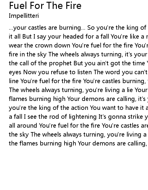 ...your castles are burning... So you're the king of the action You want to have it all But I say your headed for a fall You're like a man on a mission You wanna wear the crown down You're fuel for the fire You're castles burning, there's fire in the sky The wheels always turning, it's your turn to do or die You hear the call of the prophet But you ain't got the time You let the smoke get in your eyes Now you refuse to listen The word you can't deny Your destiny is on the line You're fuel for the fire You're castles burning, there's fire in the sky The wheels always turning, you're living a lie Your castles are falling, the flames burning high Your demons are calling, it's your turn to do or die So you're the king of the action You want to have it all But I say your headed for a fall I see the rod of lightening It's gonna strike you down I see the ashes all around You're fuel for the fire You're castles are burning there's fire in the sky The wheels always turning, you're living a lie Your castles are falling, the flames burning high Your demons are calling, it's your turn to do or die |
