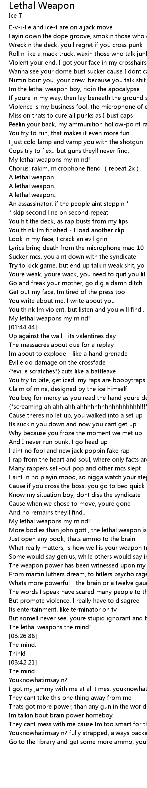 | [02:42.89] | My lethal weapons my mind! |