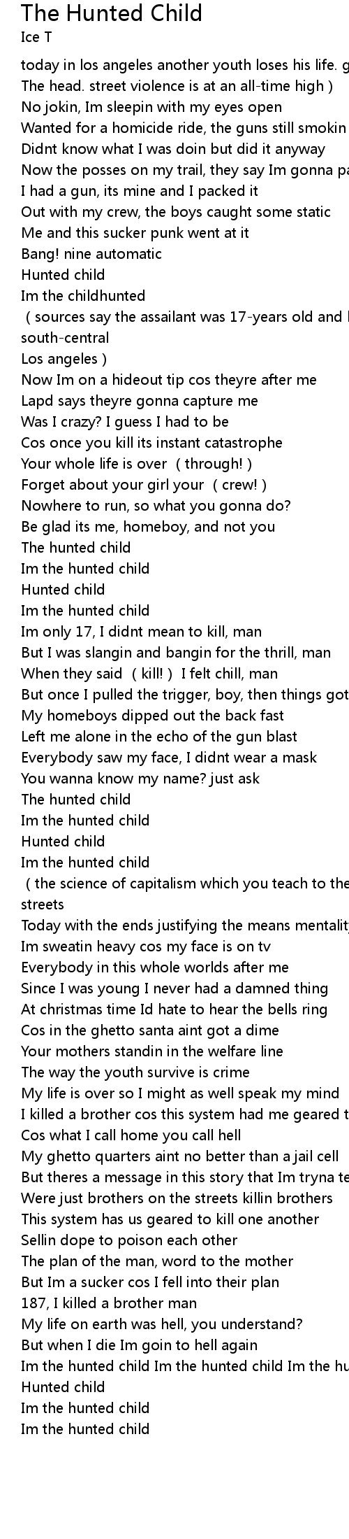 | [03:24.43] | Im the hunted child Im the hunted child Im the hunted child the |