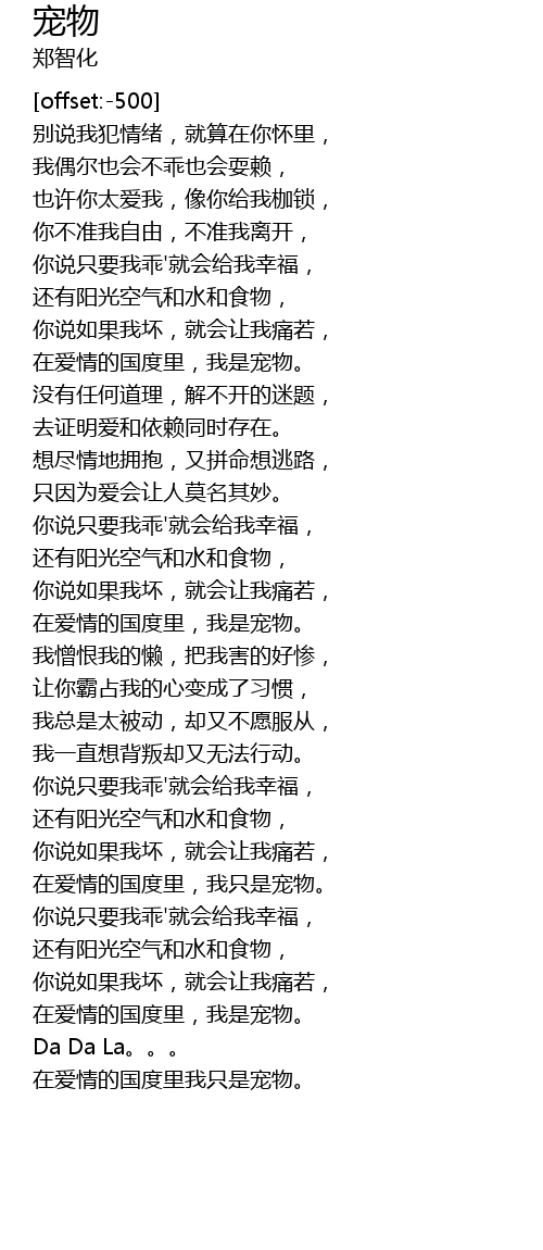 | [02:46.05] | 在爱情的国度里,我只是宠物。 |