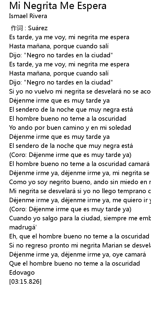 | [00:15.498] | Es tarde, ya me voy, mi negrita me espera |