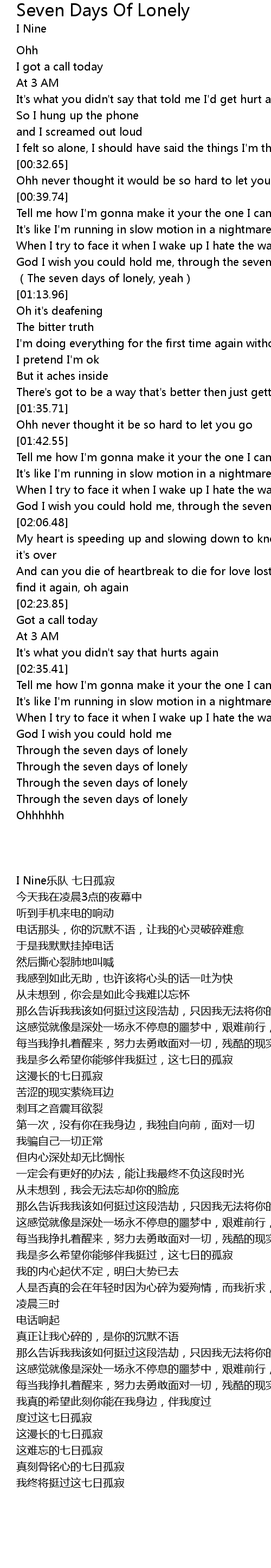 | [02:01.34] | God I wish you could hold me, through the seven days of lonely. |