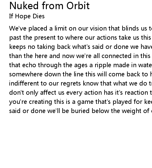 We've placed a limit on our vision that blinds us to our future we can't see past the present to where our actions take us this is a game that's played for keeps no taking back what's said or done we have to understand that there's more than the here and now we're all connected in this life actions have consequences that echo through the ages a ripple made in water that turns into a wave somewhere down the line this will come back to haunt us and time will remain indifferent to our regrets know that what we do truly matters, our decisions don't only affect us every action has it's reaction think about the legacy you're creating this is a game that's played for keeps no taking back what's said or done we'll be buried below the weight of our mistakes |