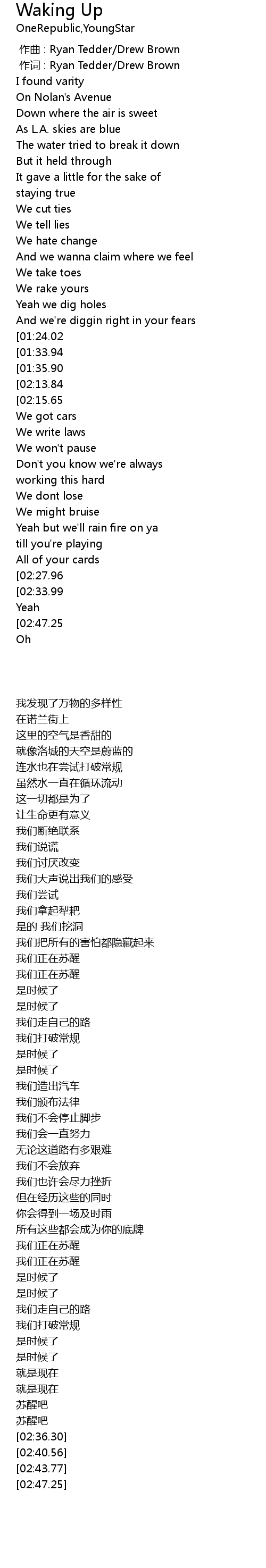| [01:21.87][01:24.02][02:05.82][02:07.68] | We' re waking up |