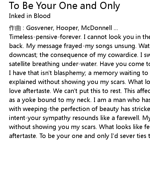 | Timeless-pensive-forever. I cannot look you in the eyes and my words-choked back. My message frayed-my songs unsung. Watching my hopes gather dust I am left downcast; the consequence of my cowardice. I swim like mad-lost at sea-a satellite breathing under-water. Have you come to save me? Your innocence is all I have that isn't blasphemy; a memory waiting to fade. My hopes cannot be explained without showing you my scars. What looks like fermented pain has a love aftertaste. We can't put this to rest. This affects everything. My sins are as a yoke bound to my neck. I am a man who has been afflicted. My eyes are spent with weeping-the perfection of beauty has stricken me. You must not suffer my intent-your sympathy resounds like a farewell. My hopes cannot be explained without showing you my scars. What looks like fermented pain has a love aftertaste. To be your one and only I'd sever ties to life |