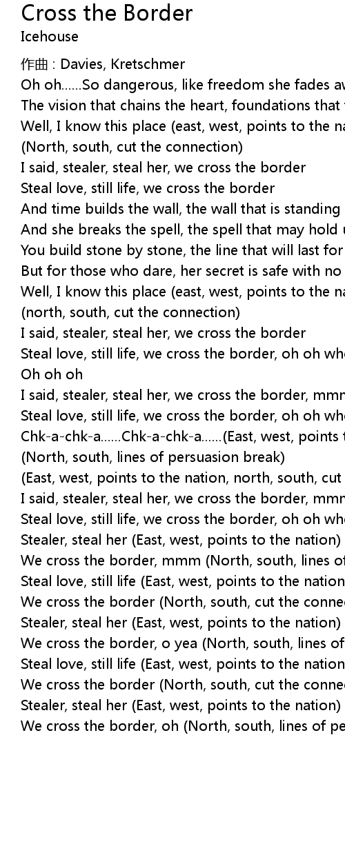 | We cross the border, mmm North, south, lines of persuasion break | |