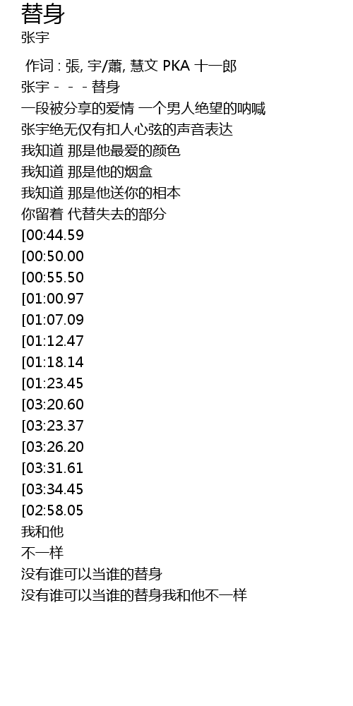 | [04:21.56] | 没有谁可以当谁的替身我和他不一样 |