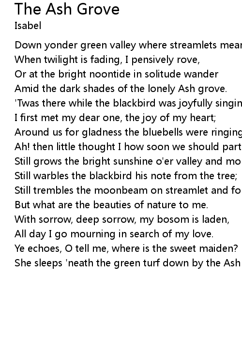 She sleeps 'neath the green turf down by the Ash grove. |