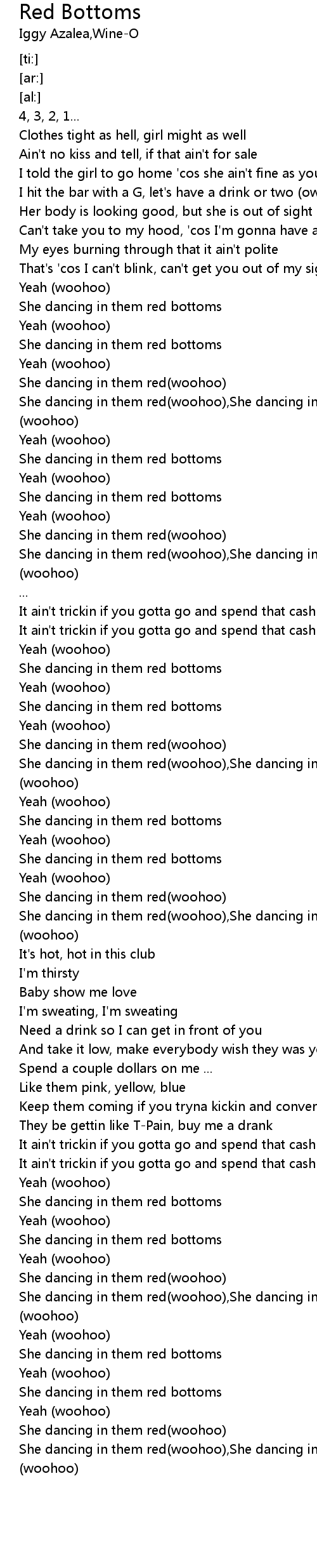 She dancing in them red(woohoo),She dancing in them red bottoms (woohoo) |