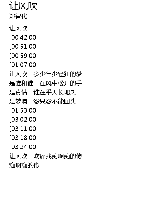 | [02:52.00][01:07.00] | 让风吹 吹痛我痴啊痴的傻 |