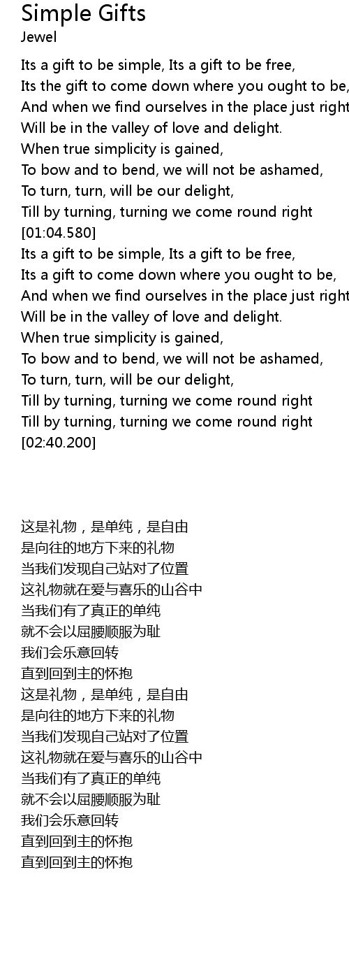 | [01:39.980] | Its a gift to be simple, Its a gift to be free, |