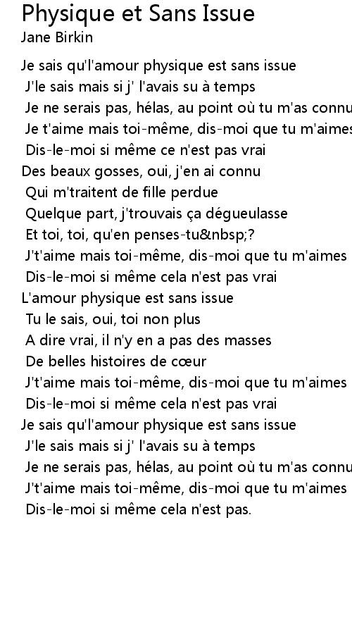 | Je sais qu' l' amour physique est sans issue | |